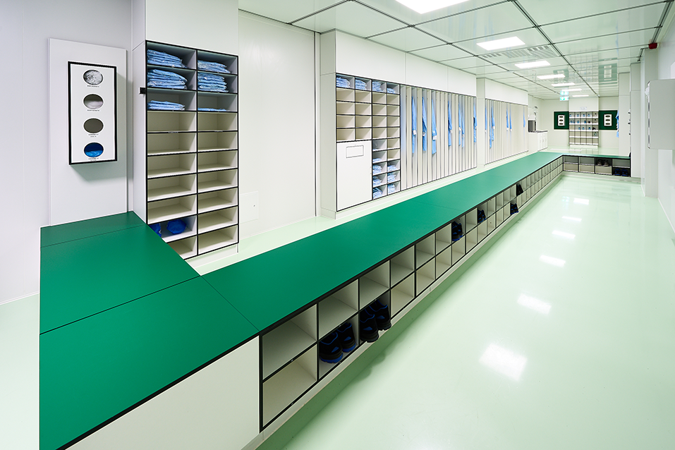 Areas where several hundred people pass through the staff airlocks every day or even per shift pose a maximum risk of contamination and thus a maximum threat to production safety. Our airlock furniture is planned and optimised to suit your operational procedures. This makes it much easier for personnel to enter cleanrooms and ensures the permanent safety of your cleanrooms and production processes. This can considerably reduce costs due to contamination and greatly optimise the flow of personnel at airlocks.